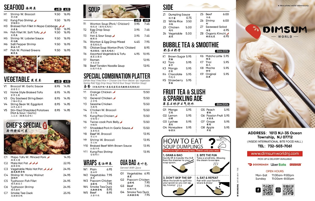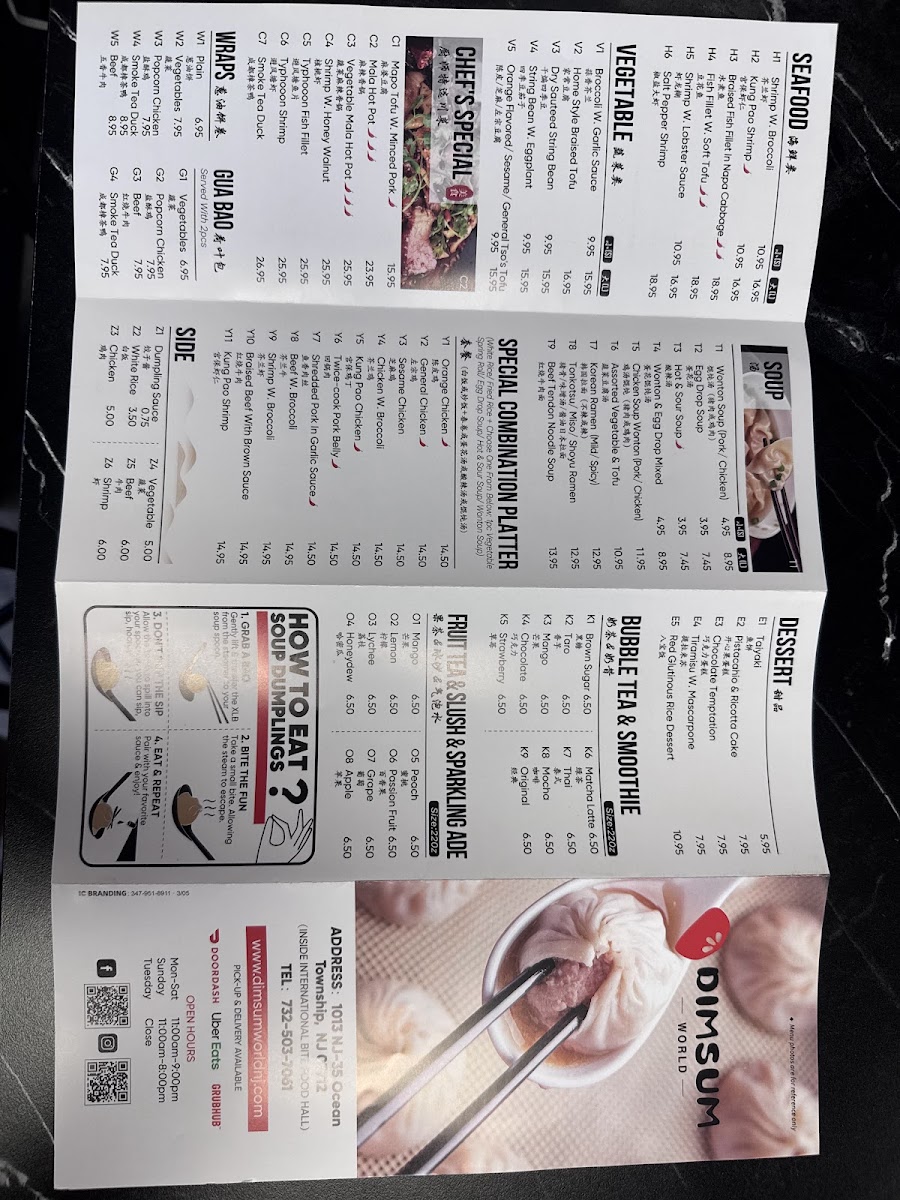 Dimsum World, located inside International Bites in Ocean Township, NJ, offers a menu that’s both expansive and enticing, perfect for those seeking a mix of classic and innovative flavors. The Homemade Dim Sum selection includes Phoenix Bun(凤凰包), Steamed Shrimp Dumpling (Har Gaw)虾饺, and Steamed BBQ Roast Pork Buns (2 Pcs)叉烧包, while the Wonton options, such as Wonton In Chili Sauce 红油抄手 and Wonton In Sesame Sauce 芝麻抄手, bring a satisfying kick. Wrap lovers can enjoy choices like Smoke Tea Duck Wrap烤鸭卷, Taiwanese Fried Chicken Wrap台湾炸鸡卷, Beef Wrap牛肉卷, and Plain Wrap葱油饼, alongside a Build Your Korean Corn Dog 韩式热狗 option. Smoothies and slushes, including Rose Milk Smoothie, Mango Smoothie, and Peach Slush, provide refreshing accompaniments.