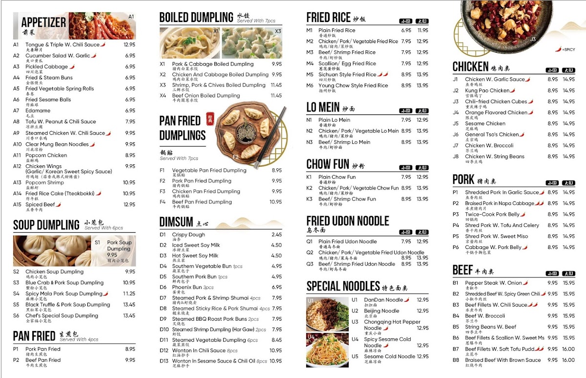 For protein-forward dishes, the Beef menu features items such as Braised Beef with Brown Sauce 红烧牛肉 and Shredded Beef W. Spicy Green Chili 小椒牛肉丝, while Pork lovers can choose from Twice-Cook Pork Belly 回锅肉 and Vermicelli W. Spicy Minced Pork 蚂蚁上树. Chicken specialties include Sesame Chicken 芝麻鸡 and Orange Flavored Chicken 陈皮鸡, and Seafood options like Shrimp W. Lobster Sauce 虾龙糊 and Kung Pao Shrimp 宫保虾仁 highlight fresh flavors. Vegetarian-friendly dishes such as Home Style Braised Tofu 家常豆腐 and Sesame Tofu 芝麻豆腐 complement the menu.
